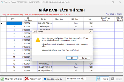 - Do danh sách thí sinh đang sử dụng có cấu trúc khác với danh sách thí sinh của phần mềm