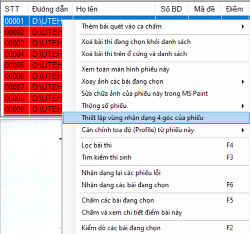 - Nhấp chuột phải vào 1 bài bất kỳ chọn Thiết lập vùng nhận dạng 4 góc của phiếu -> Căn chỉnh cùng nhận dạng vào 4 chốt ở 4 góc của phiếu