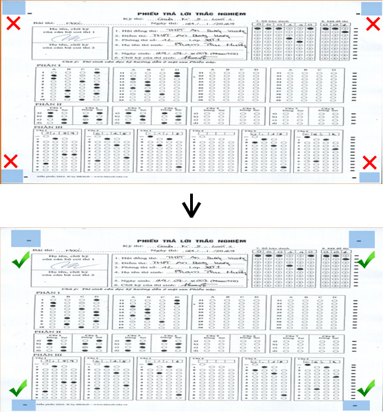 - Phần mềm không nhận diện được phiếu trả lời, nguyên nhân có thể do chưa thiết lập vùng nhận dạng 4 góc, chọn sai mẫu phiếu.